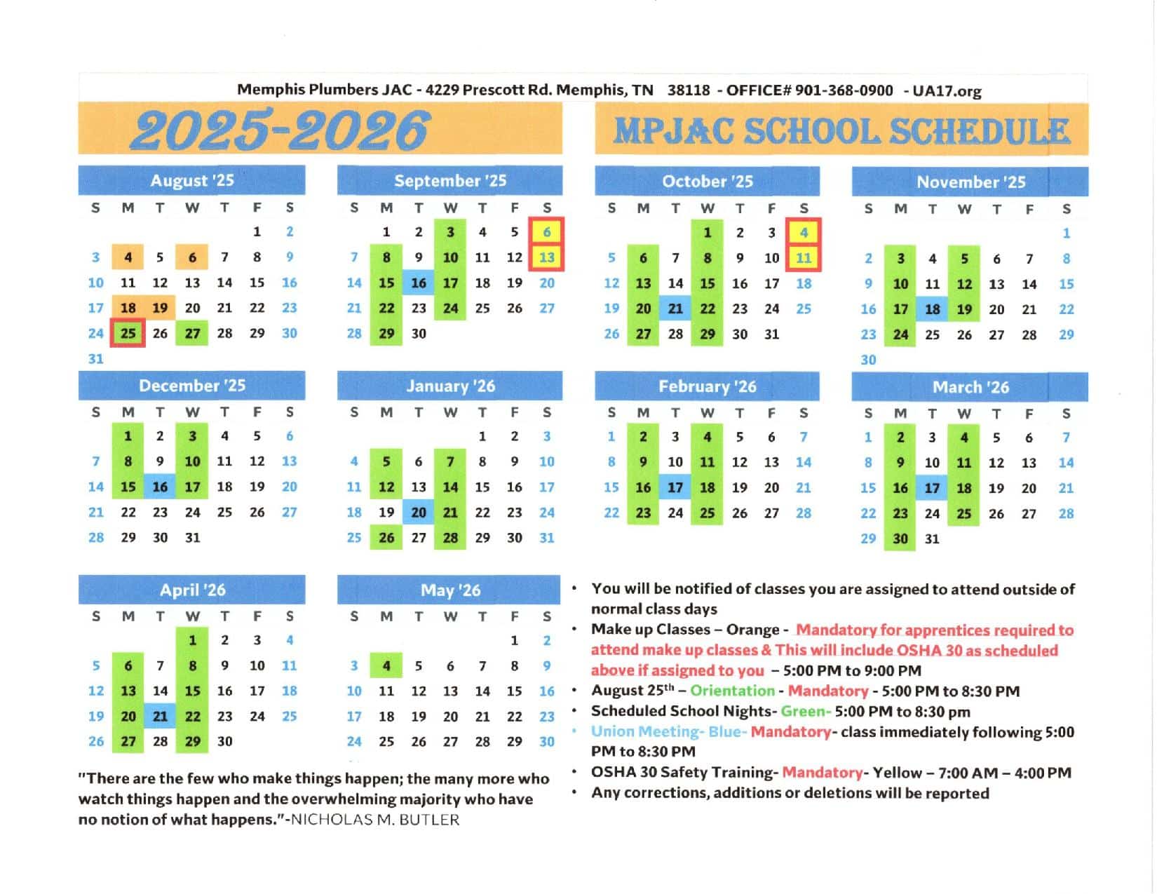 A school schedule for each year will be posted on the bulletin board in the hall of the Apprentice School and in each classroom. If the Shelby County Schools are closed due to weather conditions, the Apprenticeship School will be closed. The hours missed will be made up during each school year as scheduled by the Training Director.